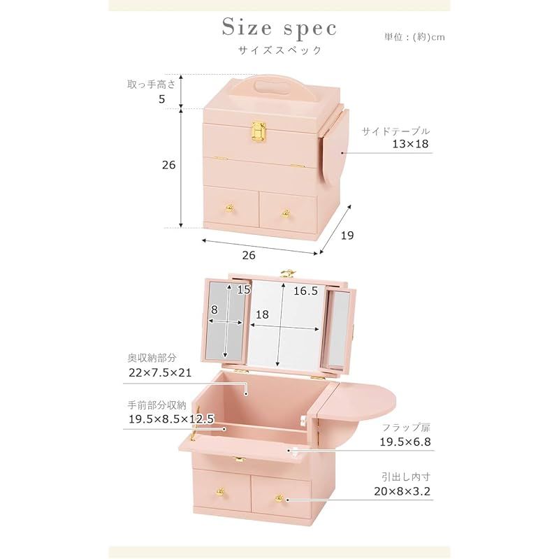 商品名:萩原 メイクボックス コスメボックス コスメ 化粧品 メイク道具 収納 【コンパクトなのに三面鏡】引き出し 鏡 ミラー 軽量 幅26×奥行19×高さ31 ピンク MUD-6930PI